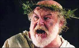 But in the same way the RSC injected darkness into the great Bard's comedy A Midsummer Night's Dream back in March, this English Touring Theatre production has infused a hoary, rambling piece of gloomy English literature with light heartedness and optimism. And where as the previous experiment failed, this one is a spectacular success, producing a breathless evening of gripping theatre. This tragedy starts with Lear, King of England, dividing up his realm between his three daughters. Before he hands over authority to his offspring, Lear asks each to voice their love for him. While Goneril and Regan give sugary and sycophantic replies, Cordelia remains silent, for she loves her father more than any words can express. After offering her several chances to speak forth her affection, Lear erupts into the first of his many vitriolic rages. He orders Cordelia's land to be divided up between her sisters - a decision that sparks the disintegration of law and order, usurped by a chaos that swarms with jealously, treachery and brutality. Played out on a large wooden dais, overlooked by a large gleaming white wall - which mirrors the production's optimistic bent - with a single doorway set in the centre, this production shuns fancy effects and gimmicks. Instead, the art and expression in Shakespeare's language is left to work its magic. As King Lear, Timothy West gives a sensational performance, playing on the complexities of his character like a master musician. The way he moves from raging ruler, to melancholic madman, to the broken and remorseful father is one of the finest demonstrations of professional acting I've seen in a long time. The intensity and emotion of his reunion with Cordelia towards the end of his life is enough to put a lump in the throat, while his skilled reading elicits mirth in the most unexpected places. The rich tapestry of characters is brought to life in expert fashion by a talented cast, and I can't really fault any of the performances I witnessed on the opening night. Playing the Earl of Gloucester, who goes from being booming and regal to blind and helpless, Michael Cronin performs with great skill and subtly. As Edmund, Gloucester's intriguingly ambitious bastard son, Dominic Rickhards is perhaps not quite nasty enough. His performance is, however, insidious enough to make you want to boo and hiss whenever Edmund begins confessing his evil intentions. Garry Cooper cuts a memorable swathe as Kent, helping elicit some of the biggest laughs of the evening while disguised as a humble manservant. As The Fool, David Cardy makes good sport in a part that will always raise a chuckle, although his clever riddles were often distorted by the music from his instrument. Credit also to Rachel Pickup for her gentle and poetic portrayal of Cordelia, an effective and dramatic contrast to her two cold, heartless sisters, played with confidence and measure by Catherine Kanter (Regan) and Jessica Turner (Goneril). Speaking of distortion, it was quite a strain to hear the dialogue during the storm scenes of Act II. My gut instinct was careless production, but after discussion with my companion for the evening, we agreed it helped portray the madness raging within the King's seething mind. The same goes for the metallic sounds that come splintering out between scenes. You can hardly call it music and some may find it disruptive and annoying, but on reflection it helps emphasise the discord clanging around inside Lear's head. This production is a big triumph for director Stephen Unwin, who has worked wonders by striking out 250-odd lines of repetitive or incomprehensible chaff. The result is a lean, mean, well-oiled piece of drama that reaches out, reels you in, and doesn't let you go until the lights go out on the final scene. Unwin also deserves praise for slipping so many humorous moments into this production. Rather than dilute the tragedy, his direction renders the terrible events that unfold so much more profound and hard to bear, as the audience recalls the laughter the dead once shared. Those who think Shakespeare to be difficult to understand, boring, irrelevant, or a combination of all of three, simply must see this production. The actors handle the dialogue with great skill and confidence, nurturing real feeling and meaning from their lines, which makes for easy comprehension. Yes, the second Act does drag a little, but thanks to Unwin's careful cuts and pacey direction watching this two and three quarter hour production never becomes a chore. As for irrelevance, nothing could be further from the truth. Lear's aside to the blind Duke of Gloucester - "Get thee glass eyes; And like a scurvy politician, seem to see the things thou dost not" - rings as true today as it when it left Will's pen 400 years ago. The play also deals with family feuds, inheritance spats, war, corruption, murder, betrayal, greed and rampant immorality; issues that are very much part and parcel of modern life in Britain. But far from leaving you on a low, there's great hope and optimism to be gleaned from the final lines of the King Lear, as two of the play's more heroic and decent characters are left to restore order. This, coupled with the thrill of seeing Shakespeare at its very best, clearly delighted a large first night audience whose thunderous applause elicited three curtain calls from West and company. That's high praise indeed from an Alhambra audience, but this outstanding production certainly deserves it. Copyright J A Waddington 2002. For syndication rights, please email. |